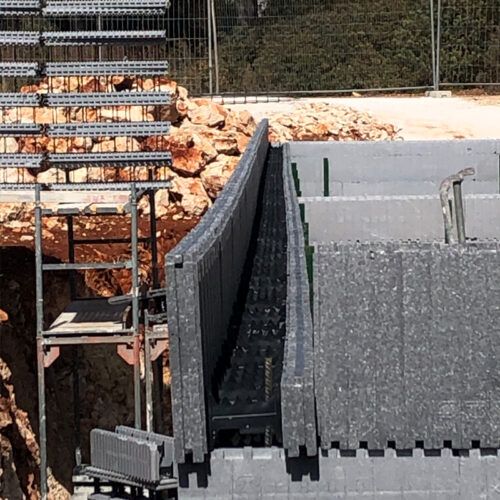 - En este núcleo de hormigón se fija el aislamiento, comenzando con 10 cm, el bloque Neopor con 25 cm de ancho. En muchas regiones de España, el bloque de Neopor con 25 cm es suficiente, logrando un valor-U de menos de 0,26 Usando los bloques VIB se puede satisfacer cualquier nivel de valor de aislamiento.